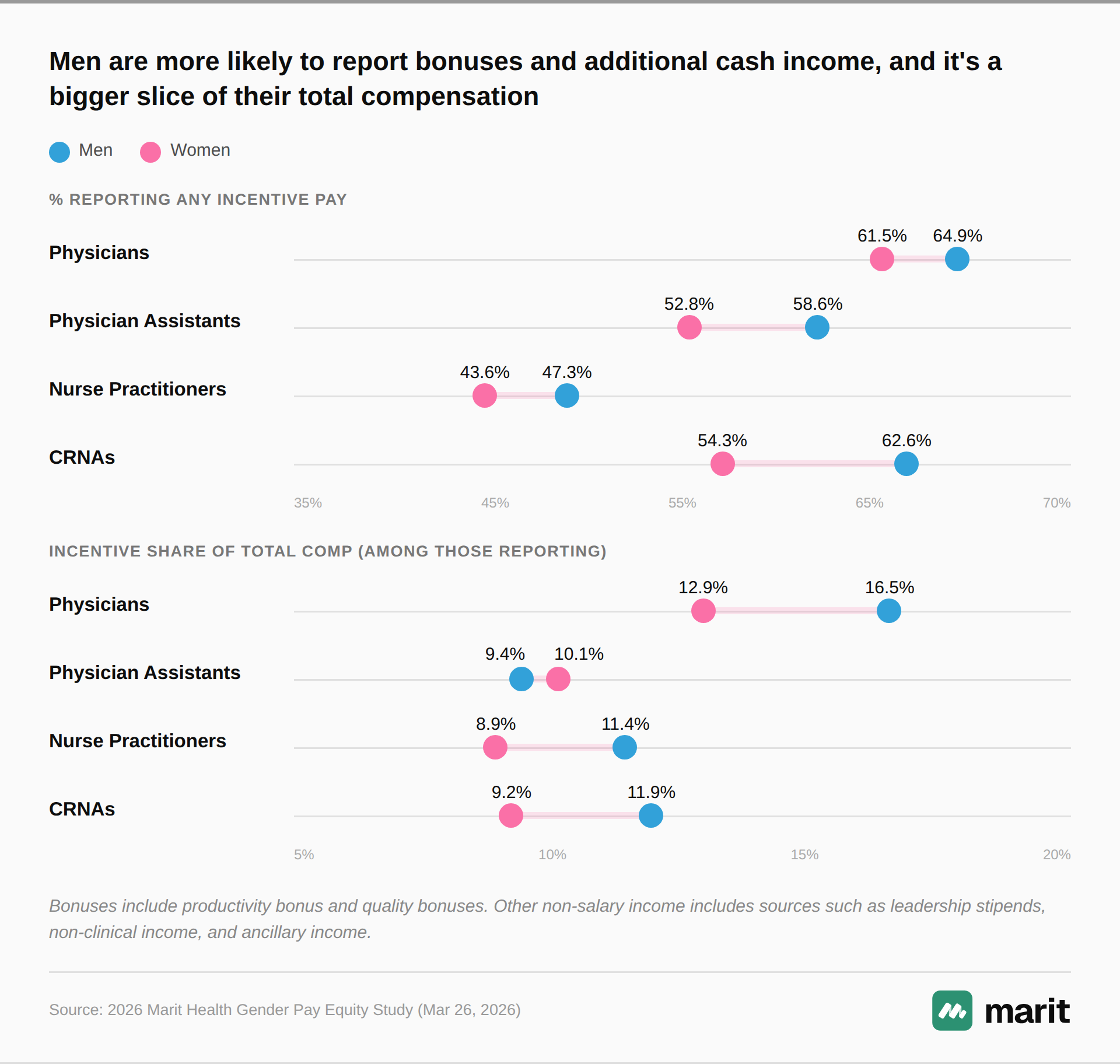 The results are based on 15,151 anonymous pay reports submitted to Marit Health for medical specialties through March 18th, 2026: 10,865 from physicians, 2,766 from PAs, 1,260 from NPs, and 260 from CRNAs. It includes only practicing professionals who reported working full time. All salary submissions are moderated using a combination of algorithmic and human moderation to ensure data accuracy. All survey respondents are asked to claim their NPI at the end of the survey to ensure submissions are for NPI verified professionals only. Sex data was obtained from the CMS NPI Registry through an NPI lookup from the survey.