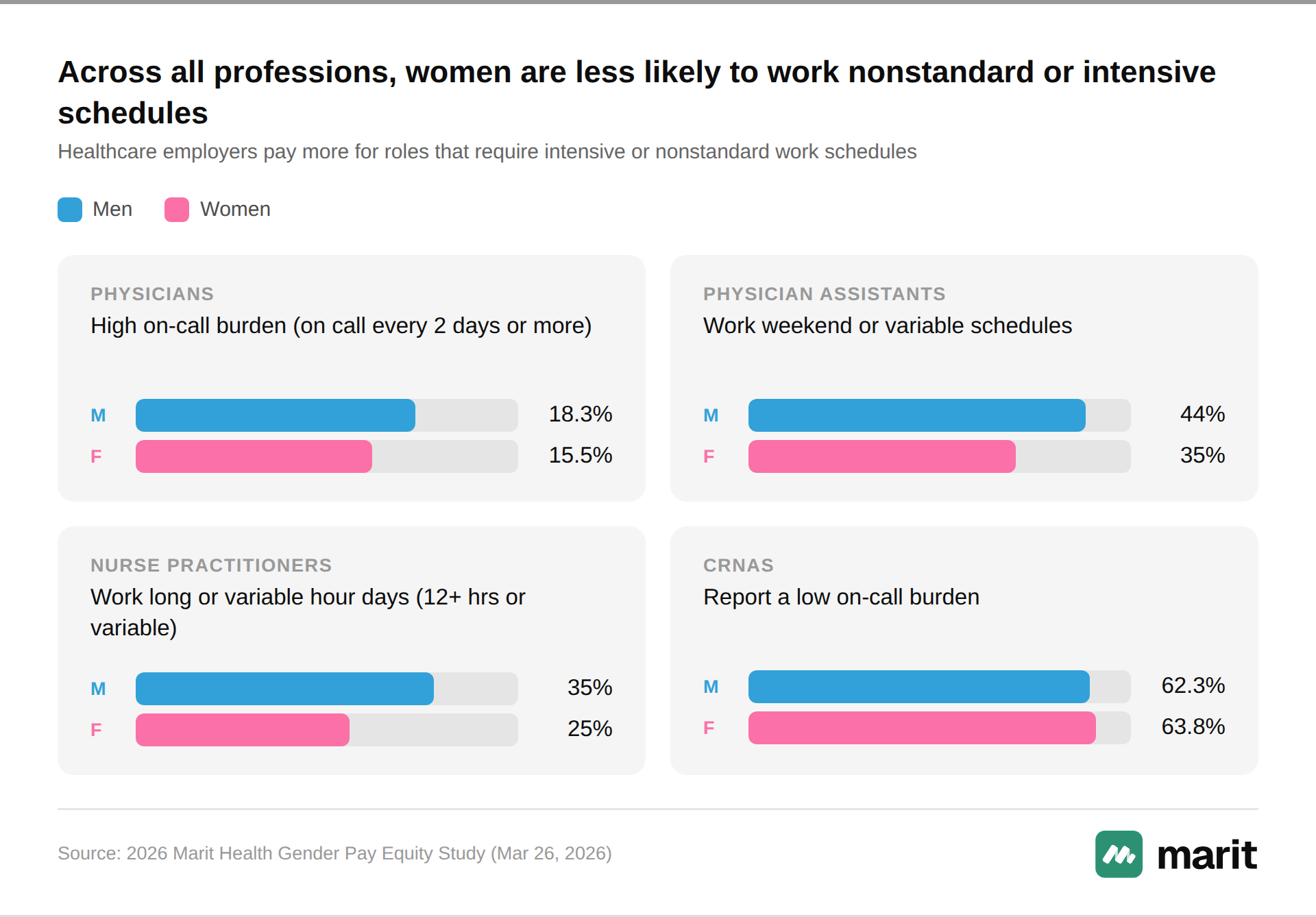 Healthcare employers pay practitioners more for roles that require intensive or nonstandard work schedules – for instance long shifts, weekend or variable schedules, or frequent on calls. Across all four professions, females are less likely to work nonstandard or intensive schedules. For example, Male physicians are 18.3% more likely to report having a high on-call burden, defined as being on call every two days or more. Further, 44% of male PAs work weekend or variable schedules, compared to 35% of female PAs. Among NPs, 25% of females report working long or variable hour days (i.e., shifts that are 12 hours or longer, or are variable) compared to 35% of male NPs. Female CRNAs are more likely to have a low on call burden: 63.8% of female CRNAs compared to 62.3% of male CRNAs report a low on call burden.